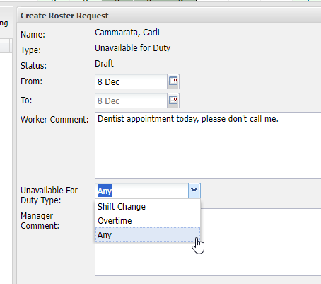 - The Create Roster Request window for "Unavailable for Duty" will show.