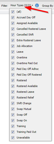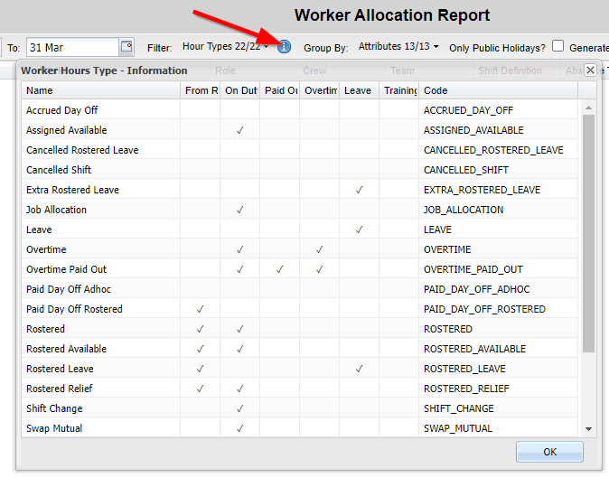 ![]() | Helpful information about each Hours Type can be viewed by clicking this button. It shows a matrix of various data attributes and what code they are represented by in the report. |