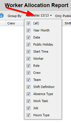 ![]() | Grouping Attributes. Select which attributes you wish to have the report grouped by. The finest granularity is achieved by selecting all items. E.g. if you wish to view data aggregated for each employee in the report, then you would just tick Worker. The report would then generate one row per worker, adding up all the hours for that worker and displaying them in the row. E.g. selecting Date and Worker would have one row for each Worker on each date they had some activity. |