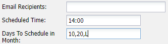 | Monthly | This report will run on specified days within a month.![]() | Days To Schedule in Month: This is a comma separated list of days in a month on which the report will run. You can specify 29,30,31 even though these days are not in every month. The report will just NOT run on those days. Also, you are able to include L as one of the values. This indicates the last day of the month, regardless of what date that actually is. |