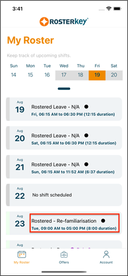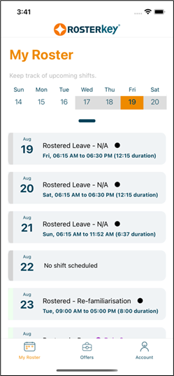 This is the default view of the My Roster Screen. When the app is loading roster information loading, a loading icon will appear next to the “My Roster” title.