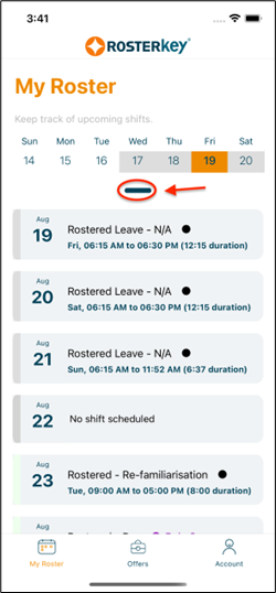 You can switch back to the Shift List view by selecting either the calendar expansion icon, or selecting any day in the calendar.