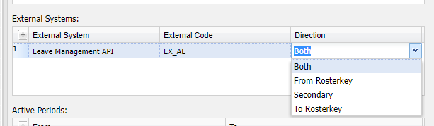 - The ROSTERkey "AL" Absence Type would have an External Code of "AL_EX" and a Direction attribute of "To Rosterkey" (or "Both").