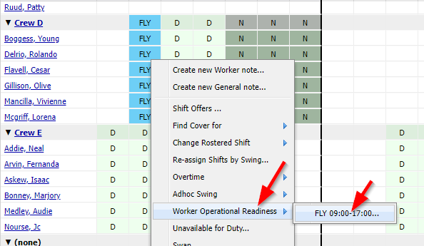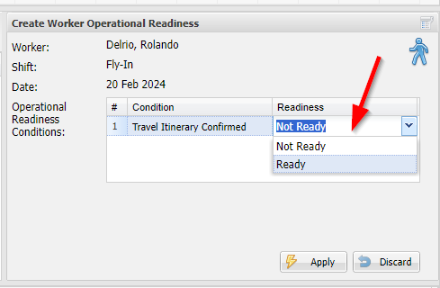 A right-click menu item is available to initiate updating the readiness value for the conditions for that worker on that day.