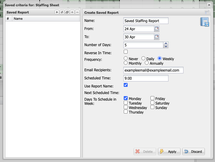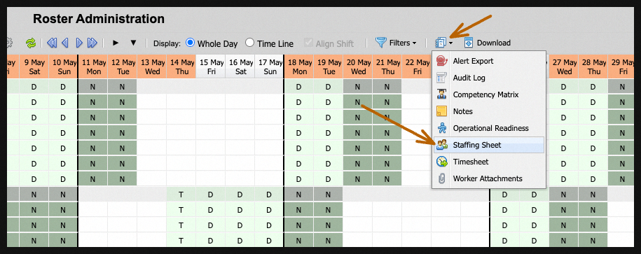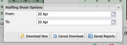 Staffing Sheets can be customised to show a range of dates, and can be downloaded on the spot if needed.