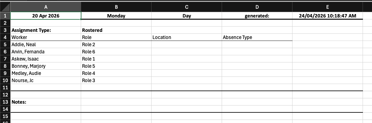 The Staffing Sheet is an Excel (.xlsx) report that shows worker allocations for a selected date range and department. It is downloaded directly from the Roster Administration page, if your organisation has Staffing Sheets available as an Additional Setting.